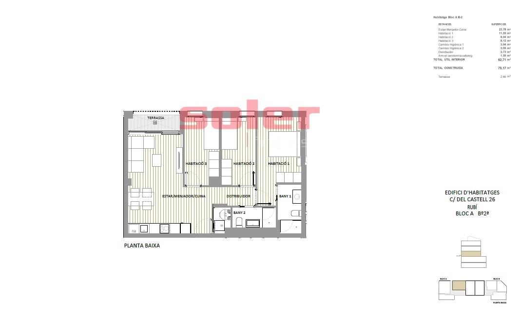 Planta baja en venta en calle Castell, Rubí, con una superficie total de 75,17 m construidos y una encantadora terraza privada de 2,66 m . La vivienda ofrece una organización moderna y funcional: Amplio salón-comedor con cocina abierta, 3 habitaciones y 2 baños completos. Edificio de nueva construcción con ascensor y posibilidad de plaza de aparcamiento en la misma finca (opcional). Situado en una zona tranquila de Rubí, bien comunicada y con todos los servicios cerca. Precio de venta: 279.000 Superficie: 75,17 m construidos 3 habitaciones 2 baños completos Cocina abierta al salón Terraza privada de 2,66 m Parking opcional Obra nueva con ascensor En Soler Finques somos API colegiados; nuestros valores primordiales son la honestidad y la profesionalidad, y estaremos encantados de ofrecerle toda la información sobre el inmueble con total transparencia y acompañarle durante todo el proceso.
