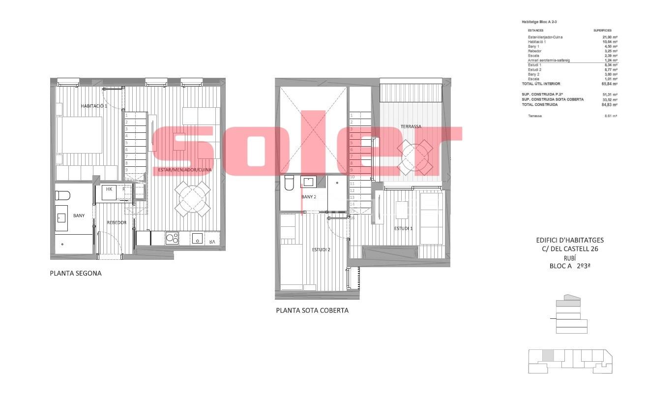 Piso dúplex en venta en calle Castell, Rubí, con una superficie total de 84,83 m construidos y una encantadora terraza privada de 11m2. La vivienda se distribuye en dos plantas y ofrece una organización moderna y funcional: Planta inferior: amplio salón-comedor con cocina abierta, un baño completo y acceso a la terraza. Planta superior: 2 habitaciones, 1 estudio ideal como despacho o vestidor, y un segundo baño completo. Edificio de nueva construcción con ascensor y posibilidad de plaza de aparcamiento en la misma finca (opcional). Situado en una zona tranquila de Rubí, bien comunicada y con todos los servicios cerca.